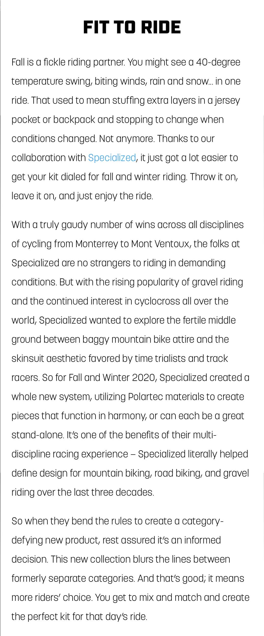 Polartec is a classic example of a “brand inside the brand” situation. They are constantly innovating for better warmth, better breathability, lighter weight and durability. They invented fleece. They are still inventing. In this case, I was writing about their partnership with Specialized, which was firmly in the center of my wheelhouse, as someone who raced bikes for decades. Fun client.
